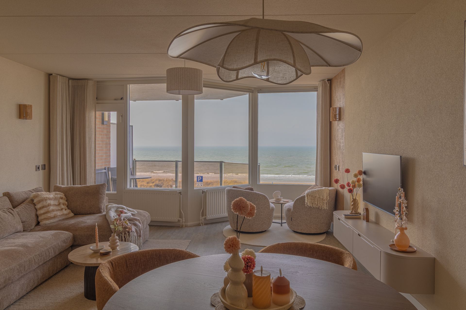 De woonkamer is licht, sfeervol en modern ingericht, met een prachtig vrij uitzicht over zee. De comfortabele loungebank nodigt uit om heerlijk te ontspannen terwijl je uitkijkt over het strand en de horizon. Dankzij de grote raampartijen geniet je de hele dag van het bijzondere licht en het steeds veranderende zeezicht.